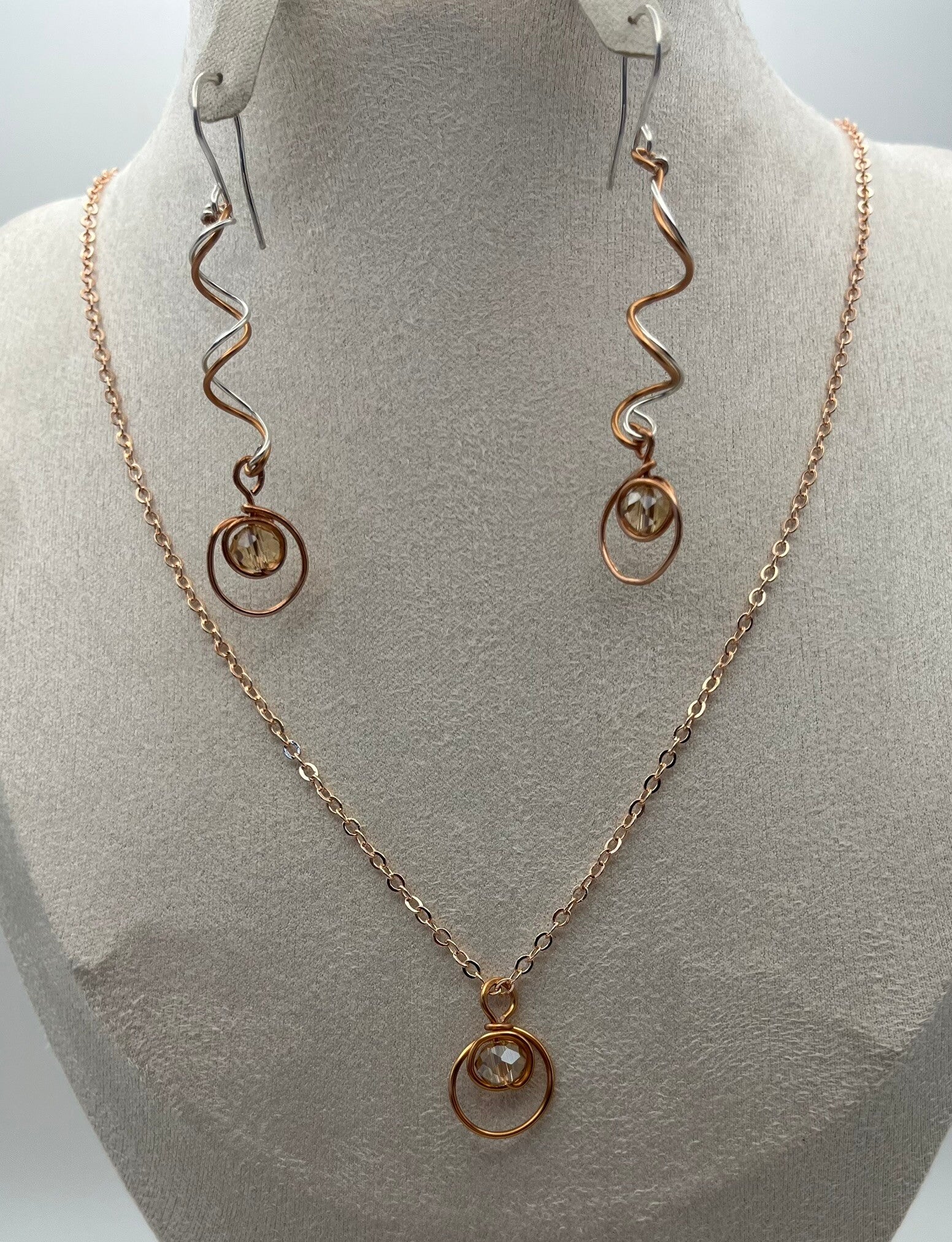 The necklace is made from copper wire with a glittering bead and light copper chain with copper lobster clasp which compliment the silver on the earrings.